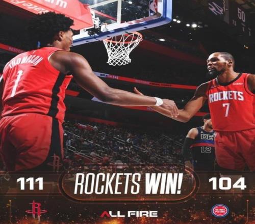 而火箭队在第2天马上就来到底特律和活塞队对决。不过火箭队很快的走出了前一场失利的阴霾,他们重振旗鼓,重新用最好的状态和活塞队较量。本场比赛虽然有多位球员因为受伤不能出战,比如说范弗里特、亚当斯、伊森和芬尼史密斯。然而,火箭队靠着仅剩的残阵,还是战胜了活塞队,拿到了一场相当宝贵的胜利,稳住了西部第四的排名没有让湖人队和太阳队超越。