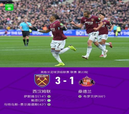 北京时间1月24日,英格兰足球超级联赛第23轮,西汉姆联主场对阵桑德兰。鲍恩送出助攻,萨默维尔破门得分;随后鲍恩主罚命中点球;上半场临近结束前,马特乌斯-费尔南德斯再入一球。下半场,穆杰莱助攻布罗贝伊为桑德兰扳回一城。最终,西汉姆联以3比1取胜。