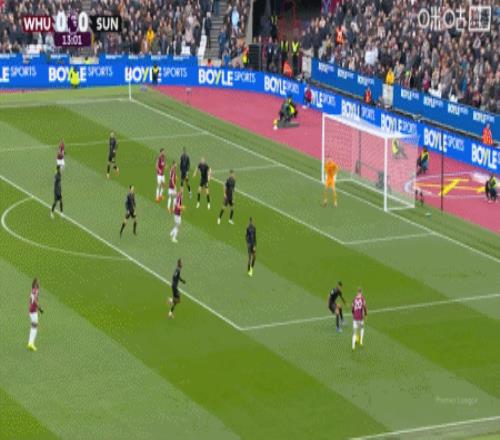 第14分钟,鲍恩右路底线传中,萨默维尔头球破门,西汉姆联1-0桑德兰