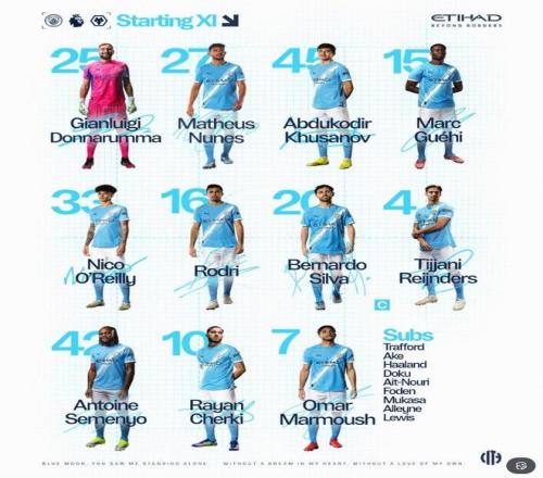 替补:1-特拉福德、6-阿克、9-哈兰德、11-多库、21-艾特-努里、47-福登、63-穆卡萨、68-阿莱恩、82-里科-刘易斯